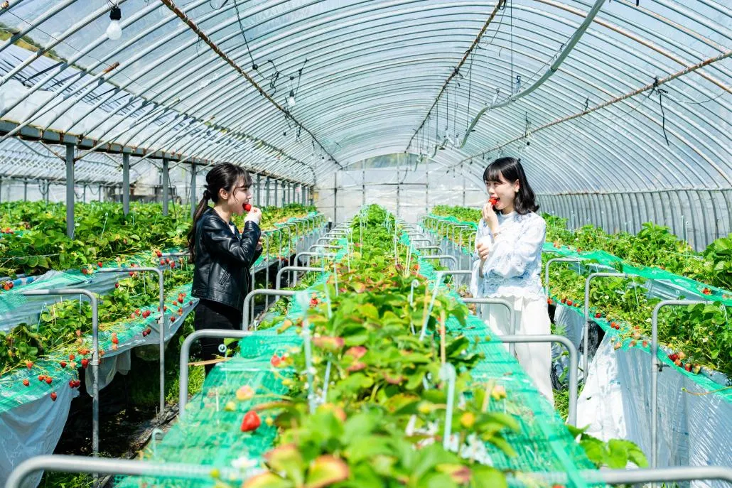 Taiken Program 体験プログラム一覧 いちご狩り体験ー玄海いちご狩り農園 🕒40 分 ●とても簡単 宗像大社から約3km。宗像市北部にある「玄海いちご狩り農園」は、70台の駐車スペースを擁する大規模農園です。